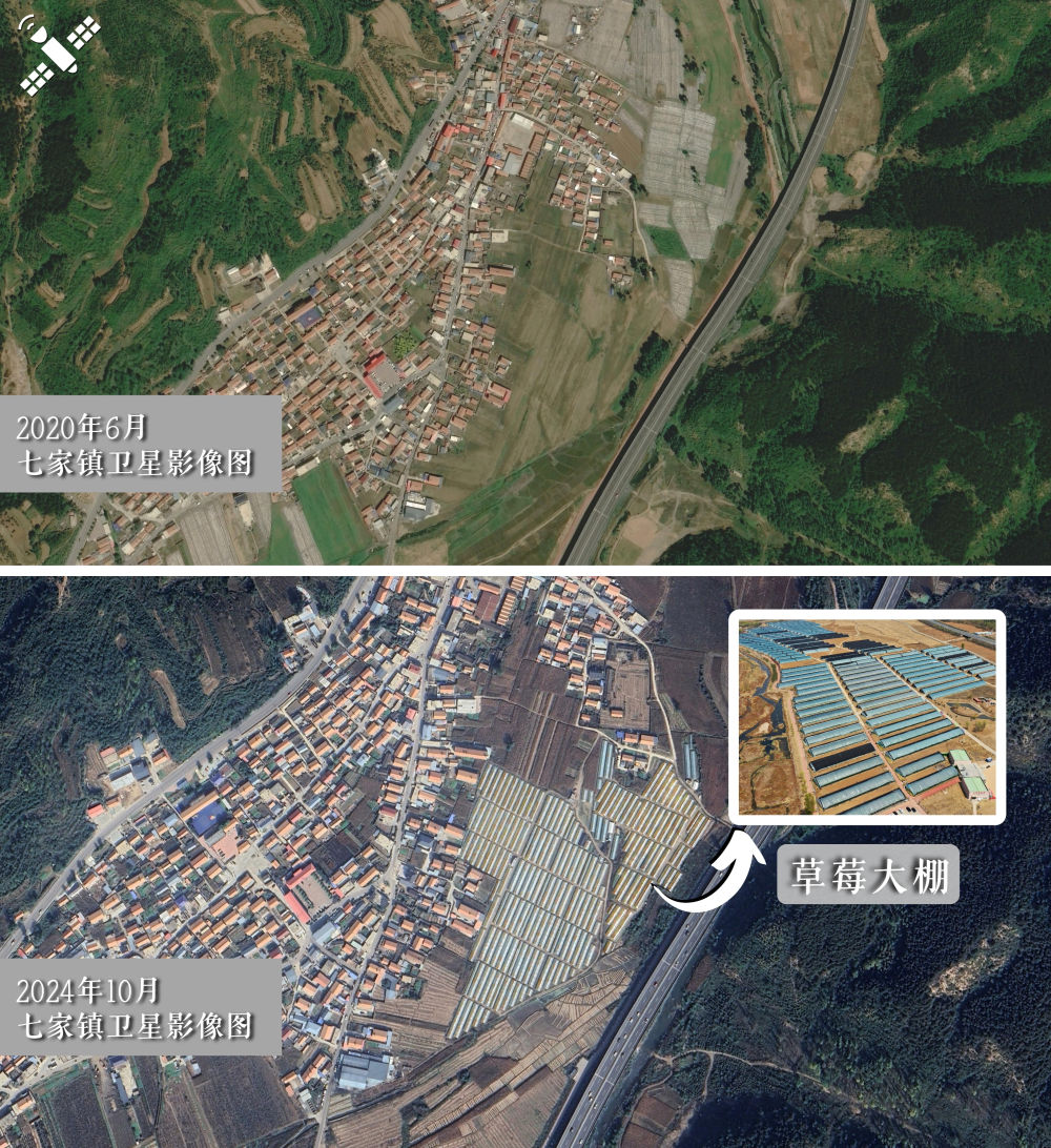 2025年是“十四五”规划收官之年,站在历史节点回望,“十四五”规划纲要指出要“坚持农业农村优先发展,全面推进乡村振兴”。从太空俯瞰,乡村路网加密延伸,连片农田温室铺展,生态旅游激活山水资源……这些变化印证了乡村振兴的切实进展,展现了农村发展的实际成效。 地点:浙江省湖州市安吉县天荒坪镇余村 解读:2020年4月原貌(上图)对比2024年6月新貌(下图),安吉余村将废弃厂房改造为“余村印象”项目,并建成余村游客综合服务中心。 浙江安吉余村是“绿水青山就是金山银山”理念发源地,该村从2003年开始关停矿山、水泥厂等污染企业,转向生态旅游发展,目前已建成4A级景区,并于2021年入选联合国首批“世界最佳旅游乡村”名单。 安吉余村的“余村印象”项目(2023年8月11日摄)。新华社记者 翁忻旸 摄 2022年,安吉余村将旧厂房改造为“余村印象”项目,它集图书馆、文创中心、研学基地等多种功能于一体。同年10月,余村景区游客综合服务中心建成运营,提供换乘、咨询等综合服务。 地点:江苏省盐城市射阳县黄沙港镇 解读:2021年2月施工初期(上图)对比2024年10月(下图),黄沙港国家中心渔港二期工程码头主体已建成。 江苏盐城黄沙港国家中心渔港二期工程于2024年9月建成试运营,包含2022.42米顺岸码头、16座突堤码头及配套设施,是国内首座全自动化渔业码头,配备智能卸货系统、水产品交易区、冷冻仓储等设施。 2024年9月16日,工人在黄沙港国家中心渔港施放浮标。新华社记者 邢广利 摄 黄沙港国家中心渔港二期工程建成投产后将在国内率先拥有全自动智能卸货码头并逐渐配套建成水产品交易、冷冻仓储、渔需物资仓储、制冰加水等功能区。 地点:河北省隆化县七家镇 解读:对比2020年6月(上图),2024年10月七家镇连片温室草莓大棚卫星图中的反光区域显著增加(下图)。 河北省隆化县七家镇草莓基地是当地乡村振兴的重要产业之一。 近年来,该镇依托区位和气候优势,大力发展草莓种植产业,建设了“四季草莓”生产基地,配套建设观光体验区,形成集种植、加工、文旅于一体的“生态+草莓”产业链。 2023年5月1日拍摄的隆化县七家镇西道村的草莓基地。新华社记者 金良快 摄 2024年10月的隆化草莓谷卫星影像图中可见连片草莓大棚群。 其中,位于七家镇西道村的隆化草莓谷,配备物流中心、草莓主题体验区等设施,打造以草莓为核心的主题农旅融合示范区,有效带动农民增收。 地点:广东省信宜市平塘镇马安村 解读:2021年1月村落原貌(上图)对比2023年2月新貌(下图),马安村文旅建筑群规模显现。 广东省信宜市马安村曾因山高谷深,交通闭塞,经济发展十分落后。近年来,随着乡村振兴战略推进,云茂高速开通,马安村依靠全村拥有的3万多亩毛竹林,推进竹海文旅项目建设,酒店民宿、游客中心、咖啡馆、土特产店、大型地下停车场成为村里的标配,村庄面貌焕然一新。 2024年8月14日拍摄的广东省茂名市信宜市平塘镇马安村夜景。新华社发(何华文 摄) (来源:新华社) |