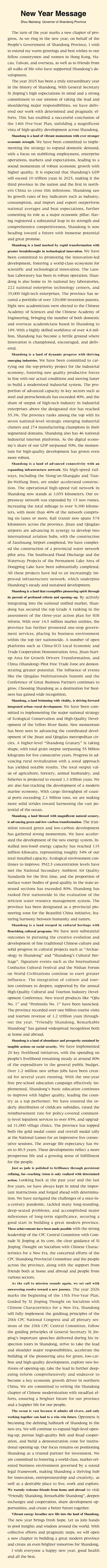 新 年 贺 词 山东省省长 周乃翔 岁序更易,华章日新。值此辞旧迎新之际,我谨代表山东省人民政府,向关心支持山东发展的港澳同胞、台湾同胞、海外侨胞和社会各界朋友,致以诚挚的问候和美好的祝福! 2025年是山东发展史上很不平凡的一年。我们牢记习近平总书记厚望重托,坚定扛牢“走在前、挑大梁”使命担当,稳扎稳打、踏踏实实做好各项工作,实现“十四五”圆满收官,齐鲁大地展现出高质量发展的壮阔图景。 齐鲁大地蓬勃向上,经济实力“向强而跃”。我们坚定实施扩大内需战略,着力稳就业、稳企业、稳市场、稳预期,全省经济保持稳健向好、进中提质良好态势,预计地区生产总值超过10万亿元,成为全国第三个、北方第一个过10万亿元省份;工业、消费、进出口等指标增速均好于全国平均水平、好于预期,经济大省挑大梁作用更加凸显。山东发展实力、综合竞争力明显增强,前景无比广阔、未来无比光明。 齐鲁大地日新月异,科技创新“向高而攀”。我们坚持创新引领,持续打造一流科技创新生态,崂山实验室高质量运行,全国重点实验室达到36家,国家企业技术中心达到222家,高新技术企业达到3.5万家,发明专利拥有量超过32万件;新当选两院院士8人,住鲁两院院士和海外学术机构院士达到189人,高技能人才超过480万人,崇尚创新、鼓励创新、成就创新的沃土日益厚植。 齐鲁大地千帆竞发,产业发展“向新而升”。我们深入实施工业经济“头号工程”,因地制宜发展新质生产力,加快建设现代化产业体系。钢铁、石化等重点行业先进产能占比超过40%,高新技术产业产值占比达55.3%;国家级战略性新兴产业集群7个、制造业单项冠军274家,均居全国前列;国家级工业互联网平台达46家,数字经济占GDP比重超过50%,高质量发展动能更加澎湃。 齐鲁大地通衢广陌,基础设施“向畅而达”。雄商、津潍等6条高铁加快建设,高铁通车里程达到3055公里;新建成高速公路15条,通车里程突破9300公里,六车道及以上占比超过40%;轨道交通运营里程达到578公里;济南、青岛机场协同打造国际航空枢纽,建成枣庄机场;全面完成国家省级水网先导区建设任务,东平湖老湖区洪水相机南排和航道工程基本完工,不断完善的基础设施体系支撑山东发展行稳致远。 齐鲁大地勇立潮头,改革开放“向深而耕”。积极服务和融入全国统一大市场,国企改革三年行动评估位居全国A级首位,经营主体总量超过1450万户,“高效办成一件事”纵深推进,营商环境整体水平居全国第一方阵。上合示范区、济南新旧动能转换起步区、自贸试验区等开放平台能级加快提升,跨国公司领导人青岛峰会、儒商大会等影响力持续扩大,选择山东、创业齐鲁成为广泛共识。 齐鲁大地生机盎然,城乡区域“向融而进”。黄河重大国家战略深入实施,济南、青岛都市圈协同联动破题起势。更高水平的“齐鲁粮仓”加快建设,粮食总产连续五年稳定在1100亿斤以上;片区化推进乡村振兴成效明显,农林牧渔业总产值预计超过1.3万亿元。现代海洋经济发展高地加快建设,沿海港口货物吞吐量超过21亿吨,逐梦深蓝步履更加坚实。 齐鲁大地岱青海蓝,低碳转型“向绿而行”。绿色低碳转型积厚成势,新型能源体系加快建设,非化石能源发电装机达1.35亿千瓦、占全部装机的54%左右。生态环境质量持续向好,PM2.5浓度历史性达到国家空气质量二级标准,地表水国考断面优良水体比例超过80%,国家最严格水资源管理制度考核全国第一,山东被明确为建设美丽中国省域先行区,人与自然和谐共生的生态画卷正在徐徐铺展。 齐鲁大地人文繁盛,文化事业“向荣而兴”。文化“两创”成果丰硕,“海岱考古”“山东文脉”工程扎实推进,国际孔子文化节、尼山世界文明论坛等品牌效应持续提升。文旅融合不断深化,连年举办文旅产业高质量发展大会,创新推出“齐鲁1号”“半岛1号”等文旅新产品,全年接待游客超10亿人次、旅游收入达到1.2万亿元,“好客山东 好品山东”享誉海内外。 齐鲁大地物阜民丰,民生保障“向实而为”。滚动实施20项重点民生实事,民生支出占比保持在80%左右,城镇新增就业连年超过120万人,学前一年免费教育有效落实,基础教育扩优提质、稳居全国第一阵营,育儿补贴有序发放,基层住院政策范围内报销比例提高到85%以上,累计改造村卫生室3.1万个,实现全运会“五连冠”,全省人均预期寿命达到80.5岁,人民群众生活更加殷实、获得感成色更足。 磨砺始得玉成,笃行方能致远。回首过去一年和五年,我们始终牢记嘱托、砥砺奋进,有效应对世纪疫情等冲击挑战,攻克了许多长期没有解决的难题,办成了许多事关长远的大事,新征程上现代化强省建设实现良好开局。成绩的取得,根本在于以习近平同志为核心的党中央领航掌舵,在于习近平新时代中国特色社会主义思想科学指引,是省委团结带领全省人民勠力同心、苦干实干的结果,也离不开海内外朋友和社会各界的关心支持。 击鼓又催征,奋楫启新程。2026年是“十五五”开局之年,我们将坚持以习近平新时代中国特色社会主义思想为指导,全面落实党的二十大和二十届历次全会精神,深入贯彻习近平总书记视察山东重要讲话和重要指示批示精神,锚定“走在前、挑大梁”,加快建设绿色低碳高质量发展先行区,打造高水平对外开放新高地,在进一步全面深化改革上当好排头兵,努力建设北