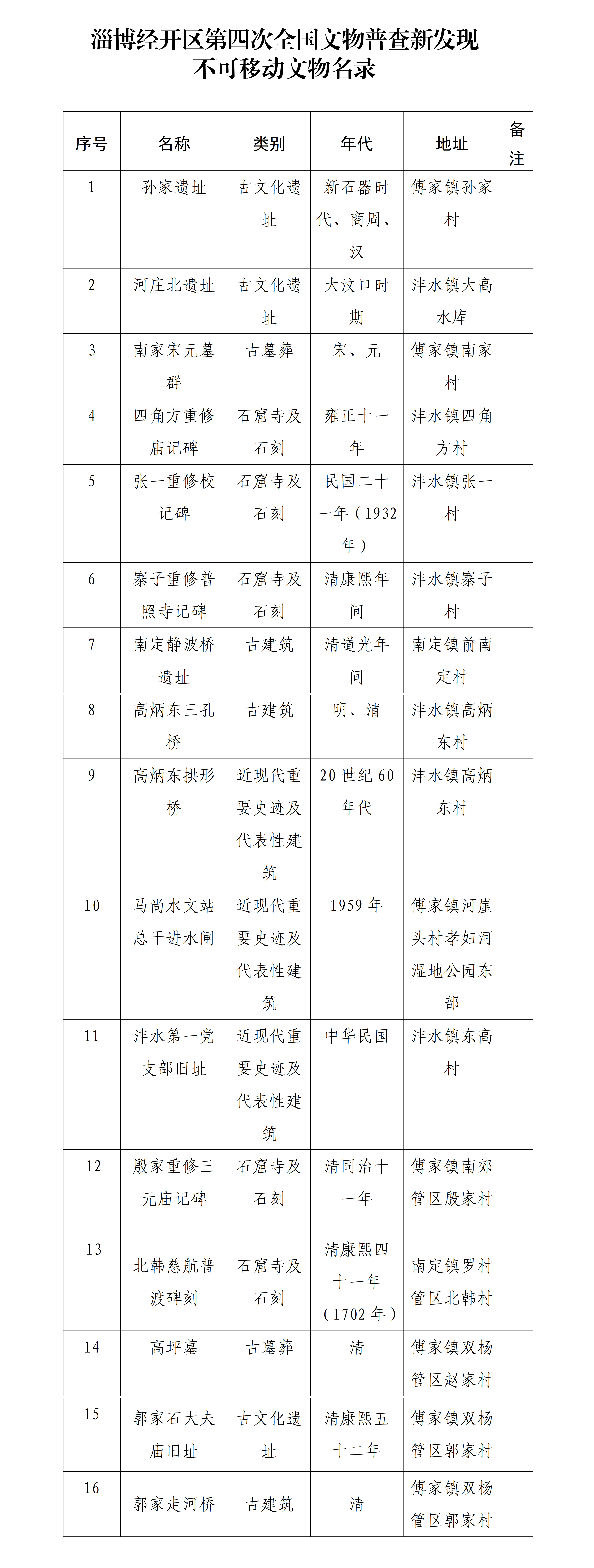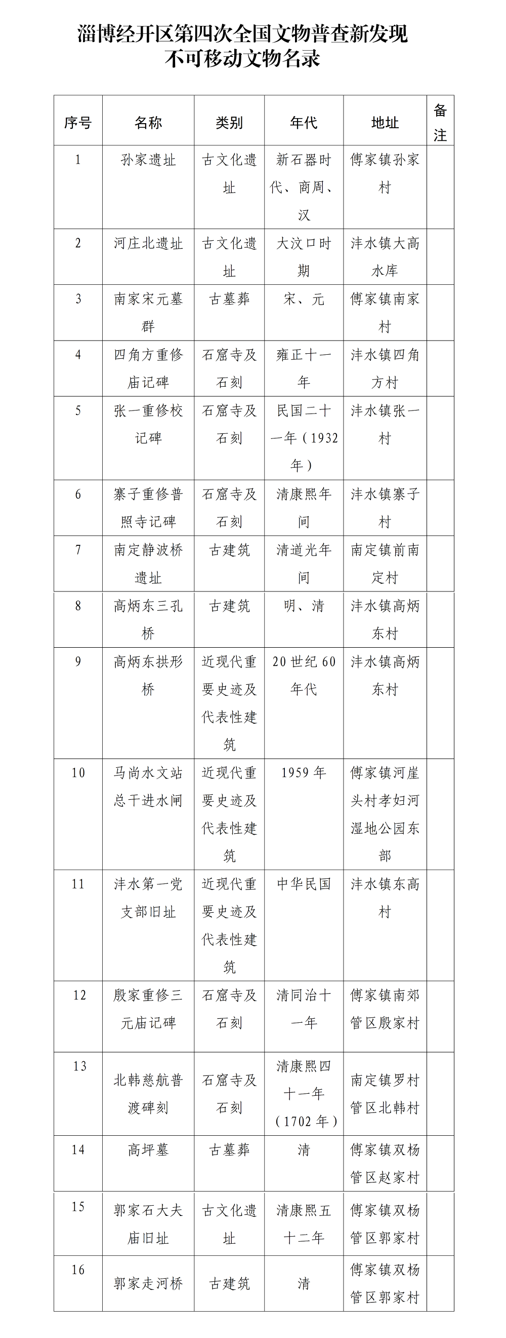 根据《国务院关于开展第四次全国文物普查的通知》(国发〔2023〕18号)及省、市相关工作要求,我区组织开展第四次全国文物普查。经实地调查、组织认定、会议研究并公示,我区依法认定、登记新发现不可移动文物16处。经相关行政区县依法公布,现将淄博经开区新发现不可移动文物名录予以公告。