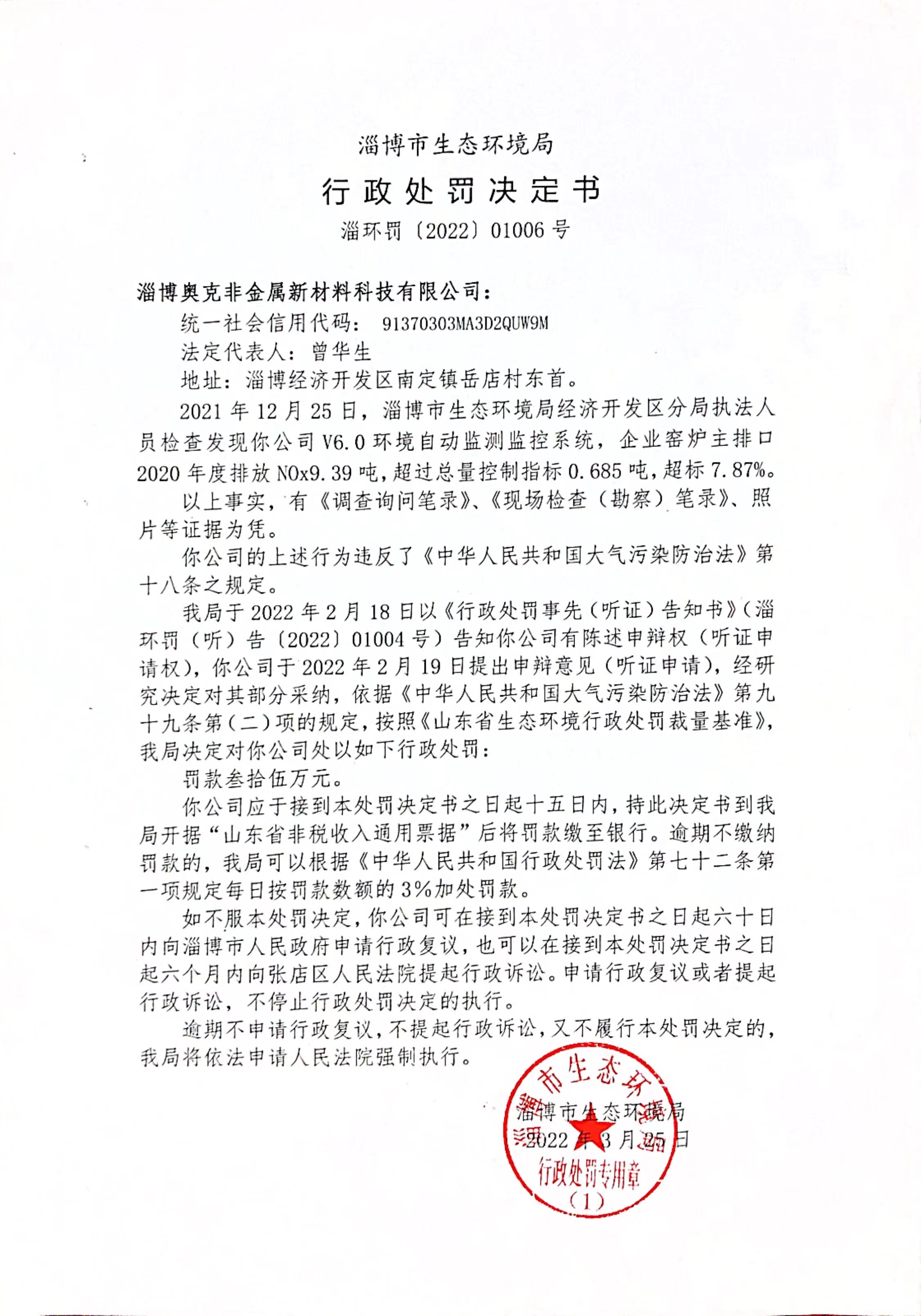 淄博市生态环境局行政处罚决定书淄环罚〔2022〕01006号
