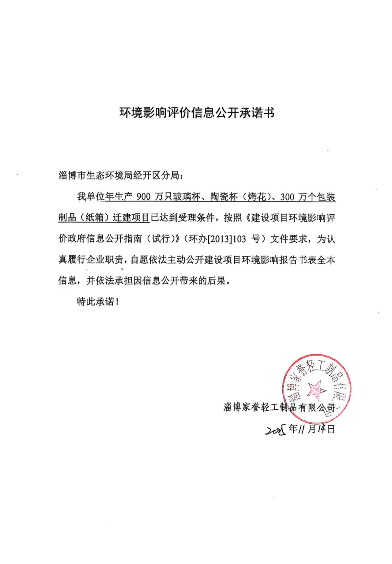 淄博家誉轻工制品有限公司年生产900万只玻璃杯、陶瓷杯(烤花)、300万个包装制品(纸箱)迁建项目.docx信息公开承诺书.jpg |