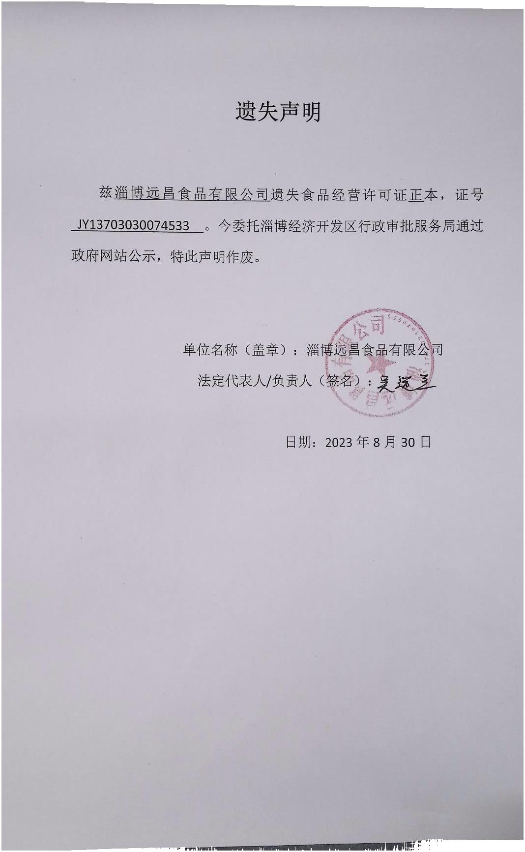 现将淄博远昌食品有限公司遗失食品经营许可证正本的信息进行公示,内容详见附件:淄博远昌食品有限公司遗失食品经营许可证正本的声明。